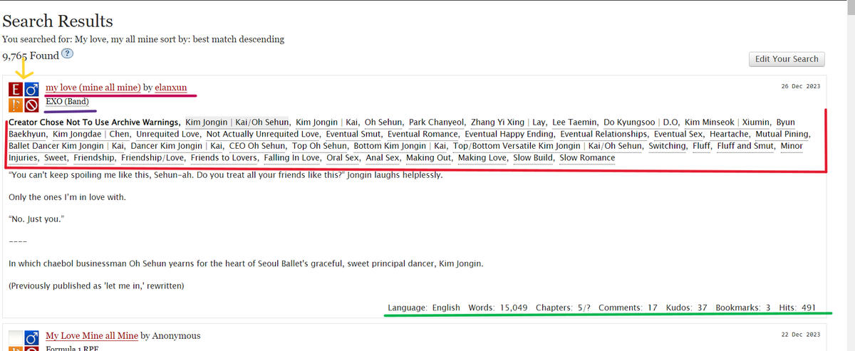 ✦ em rosa está o título e o autor✦ em roxo está o fandom✦ em amarelo estão algumas categorias como se o trabalho é explícito ou não! para saber mais é só clicar na caixinha!✦ em verde estão as informações de linguagem, quantidade de palavras, capítulos, comentários, curtidas, salvamentos e clicks respectivamente✦ em vermelho estão as tags, ou seja indicações de conteúdo e ship