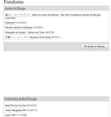 na barra de busca principal você pode digitar tanto o nome da fic que você quer ler, quanto o nome do fandom! você também pode ver a lista de fandoms clicando em All Fandoms